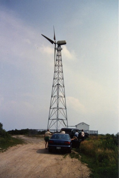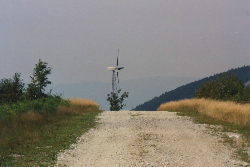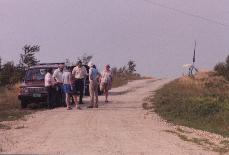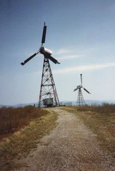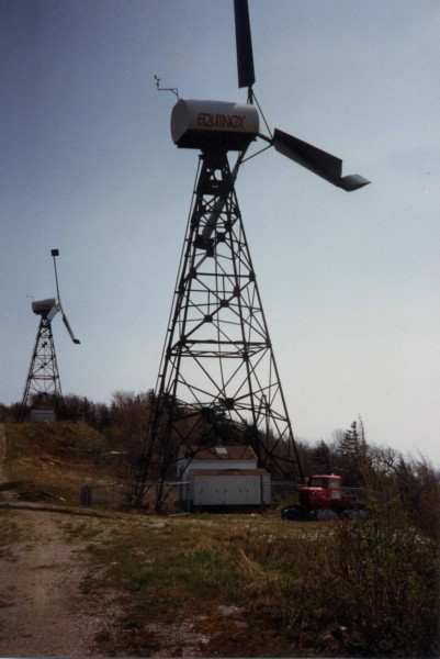 Little Equinox Mountain is the site of one of the first wind farms in the United States. In 1981, one wind turbine was installed followed by three more in 1982 . These turbines, an early-generation design by WTG Systems of Buffalo, NY, were mounted on 80-foot truss towers and had a nominal peak output of 350 kW. The turbines, however, were plagued with mechanical issues, and by the mid-1980s all four were out of service, standing idle on the mountain from 1985 through 1989.